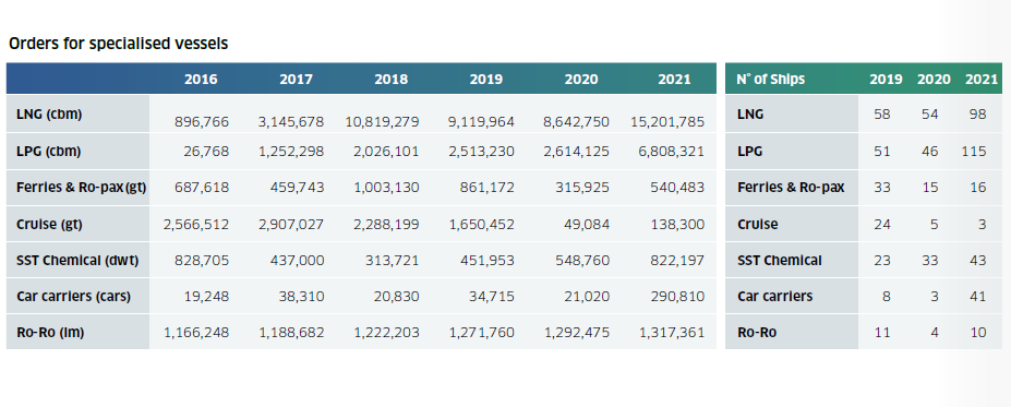 同時,去年除郵輪外的特種船市場表現(xiàn)十分活躍。2021年LNG船新船訂單量達(dá)到98艘1520萬立方米,其中12艘為LNG加注船。LPG船訂單量也達(dá)到了創(chuàng)紀(jì)錄的135艘。不銹鋼化學(xué)品船和汽車運輸訂單量均高于前幾年,而郵輪訂單幾乎消失。
