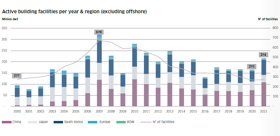 目前,全球活躍船廠(年內(nèi)接獲新訂單和/或交付新船的船廠)數(shù)量為274家,比2020年增加了4家,但僅為2007年最高約700家的40%左右。截止2021年底,全球手持訂單量從2020年底的1.8億載重噸(2003年以來最低數(shù)字)增至2.23億載重噸。