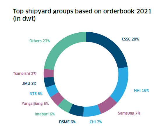 其次,在過去幾年來造船業(yè)發(fā)生了重大整合,目前世界上75%的造船產(chǎn)能掌握在9家造船集團(tuán)手中。在中國,中國船舶集團(tuán)、中遠(yuǎn)海運重工集團(tuán)和揚子江船業(yè)集團(tuán)掌握了66%的造船產(chǎn)能,比例分別為41%、14%、10%。韓國三大船企掌握了92%的韓國造船產(chǎn)能,包括現(xiàn)代重工集團(tuán)49%、三星重工22%、大宇造船21%。日本前三大造船集團(tuán)也掌握了71%的造船產(chǎn)能,包括今治造船39%、日本造船聯(lián)合(JMU)18%以及大島造船14%。